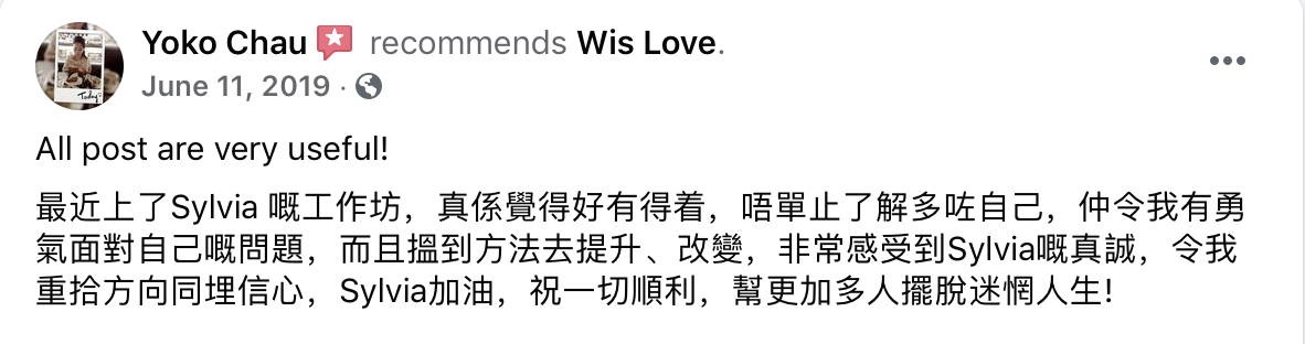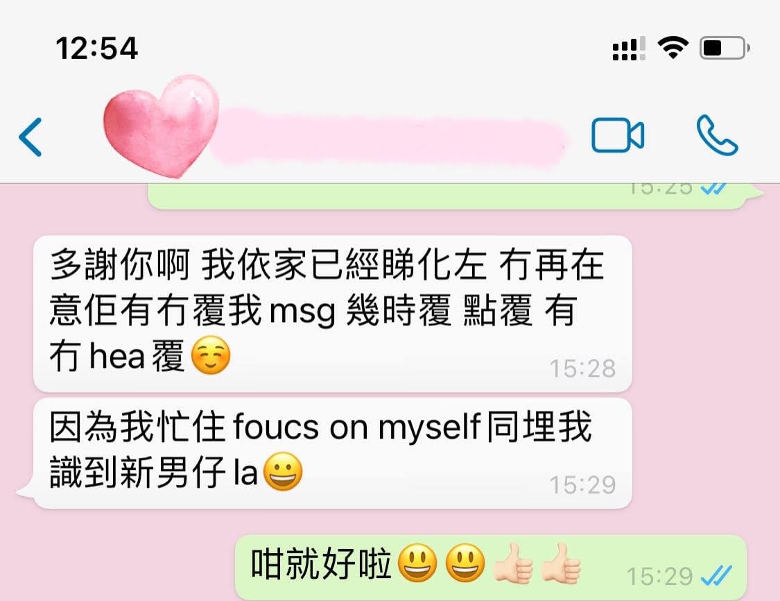 而當我開始處理好自己的感情傷口,然後開始清晰了解自己,知道自己真正想要的是什麼,懂得怎樣愛自己,一步一步去提升自己,並找回自己內在的一份力量後,我就沒有再用錯誤的方法去療癒自己,就算在我單身的日子裡,我也會很享受自己的生活,然後我的人生就開始發生很多轉變了。