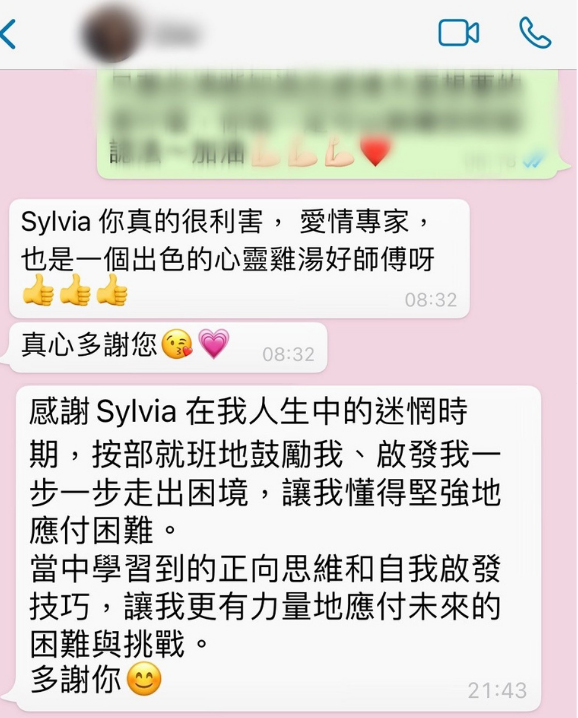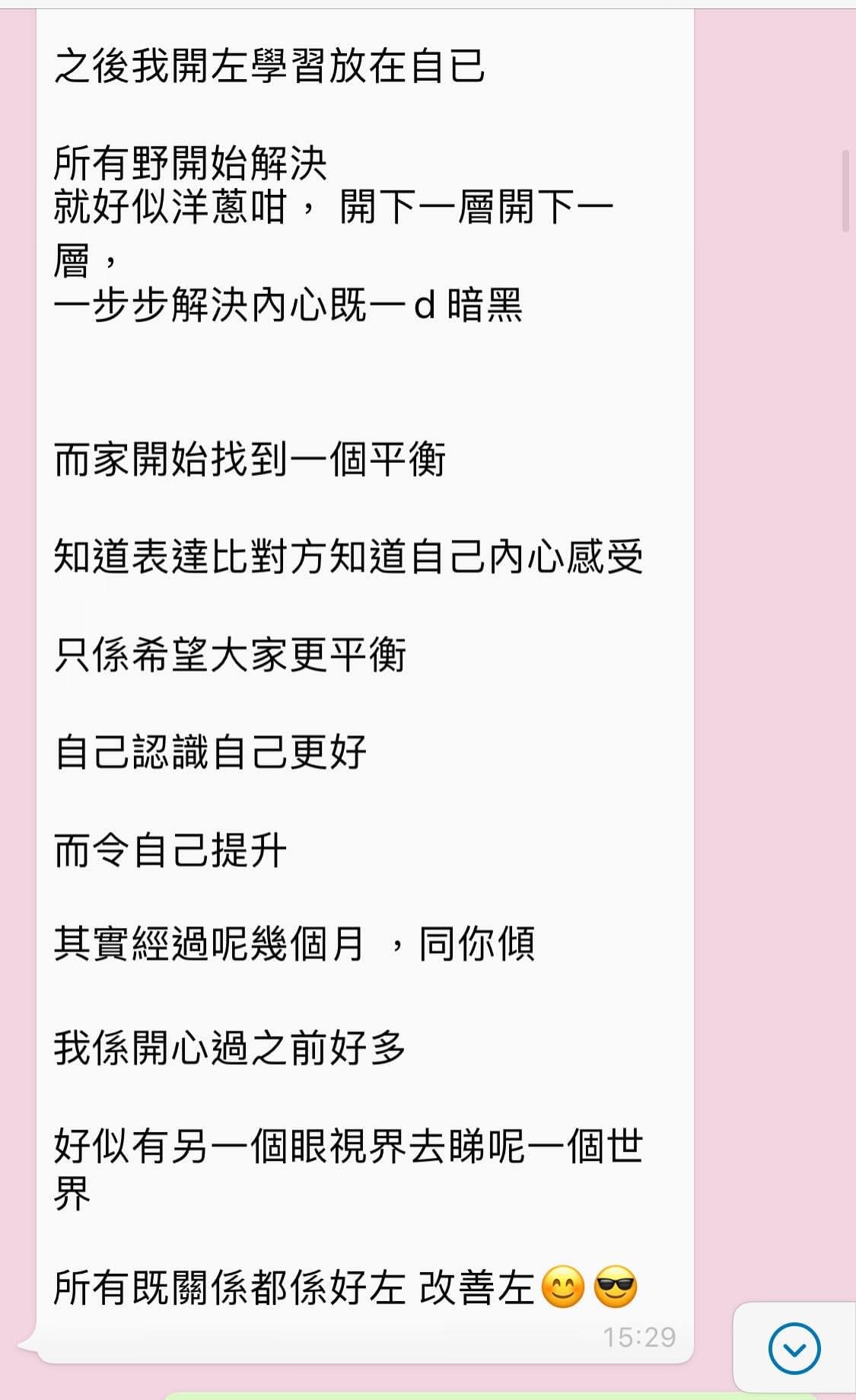 我開始學習很多關於心靈的課程,也開始了我的身心靈修練之旅,開始知道為何自己會跌入這個循環之中,同時也發覺自己一直並沒有去正視及處理過自己內在每一次因感情受傷所帶來的一些傷口。