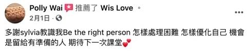 而我的經歷也成就了我現在的事業。我在2019年開展了我的心靈教育事業,就是希望可以透過我的經驗和經歷幫到更多有需要的人,因為我相信很多人都正經歷着我經歷過的事,所以我總結了過去我從感情傷害及兜兜轉轉的感情路之中走出來的一些經驗和方法,加上我在心理及心靈方面的專業知識和技巧,成就了這個《愛情GPS重新出發計劃》。在這個過程中我會和你一起,親自協助你療癒一直影響着你的感情傷口,讓你從過去的感情傷痛之中走出來,找到清晰方向,重拾希望和信心,吸引美滿的愛情關係到自己身上。